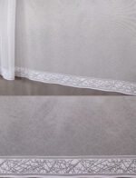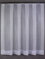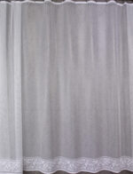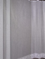Bíla luxusní žakárová záclona. Jednoduchá kanta, s rovným krajem a drobnými cákance po celé ploše. Velice jednoduchý ale hezký návrh.
