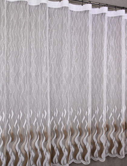Bílo-hnědá žakárová záclona s celoplošným vzorem.